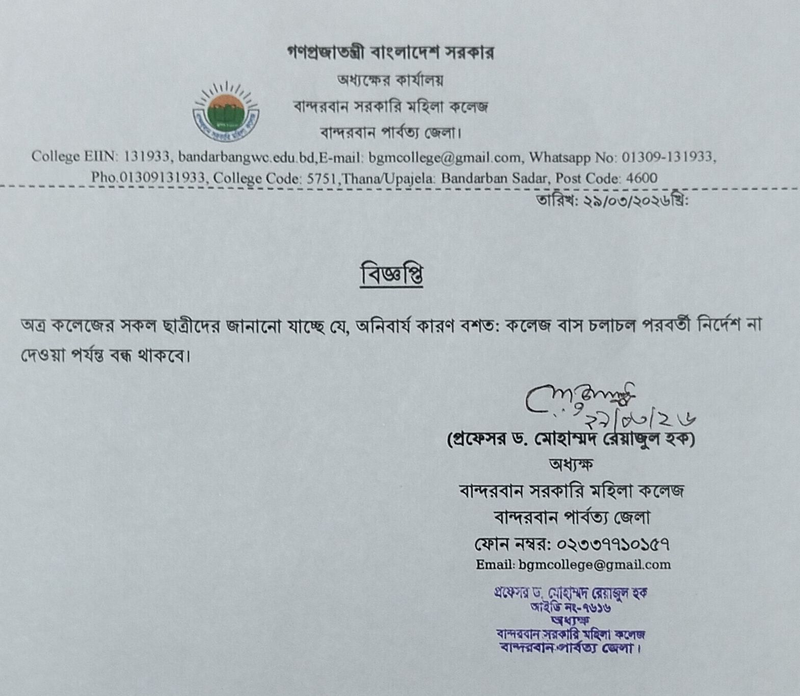 অনিবার্য কারনে বান্দরবান সরকারি মহিলা কলেজের বাস চলাচল পরবর্তি নির্দেশ না দেওয়া পর্যন্ত বন্ধ থাকবে।