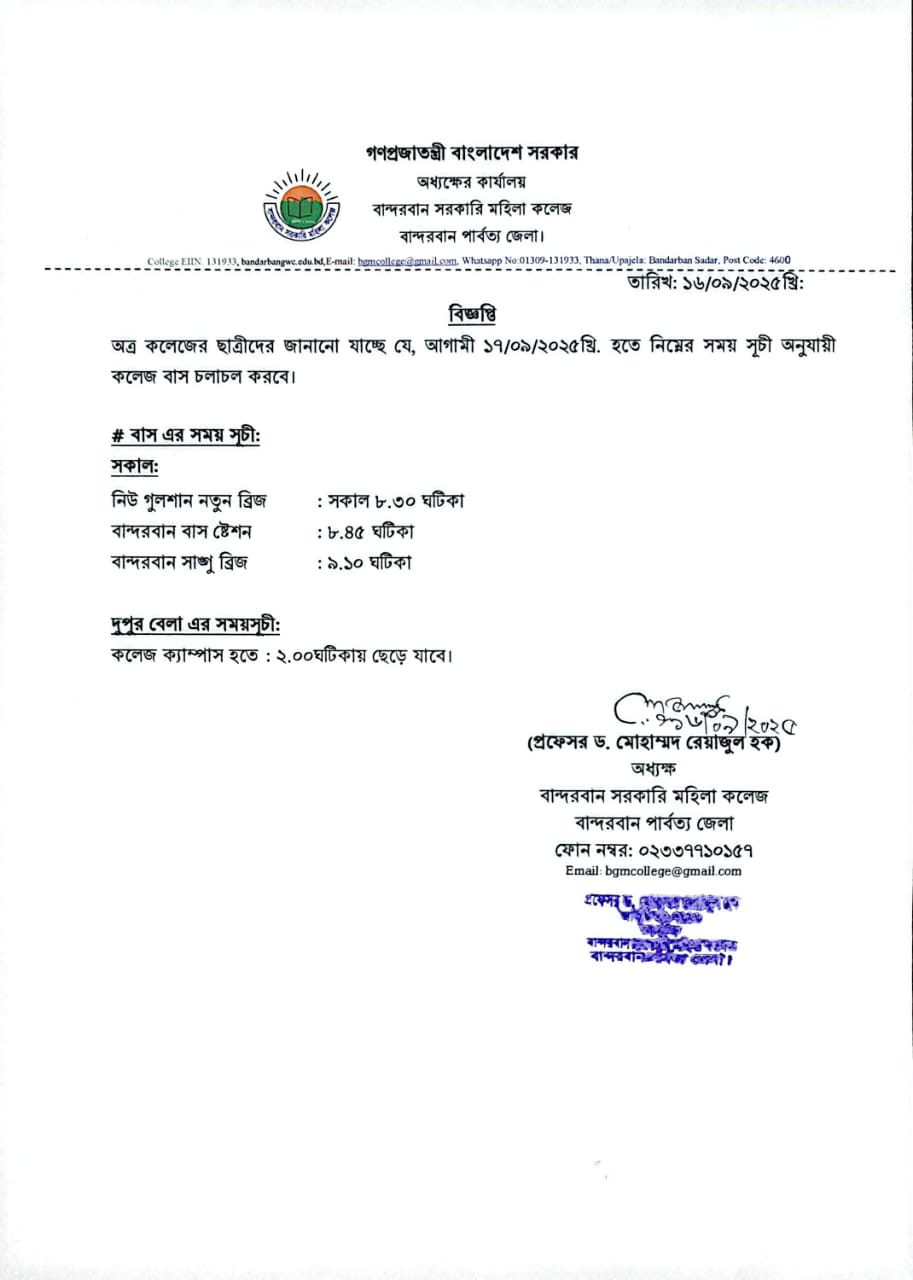 বান্বাদরবান সরকারি মহিলা কলেজের বাস নিম্চনলিখিত সময়সসূচী অনুযায়ী চলাচলের করবে।