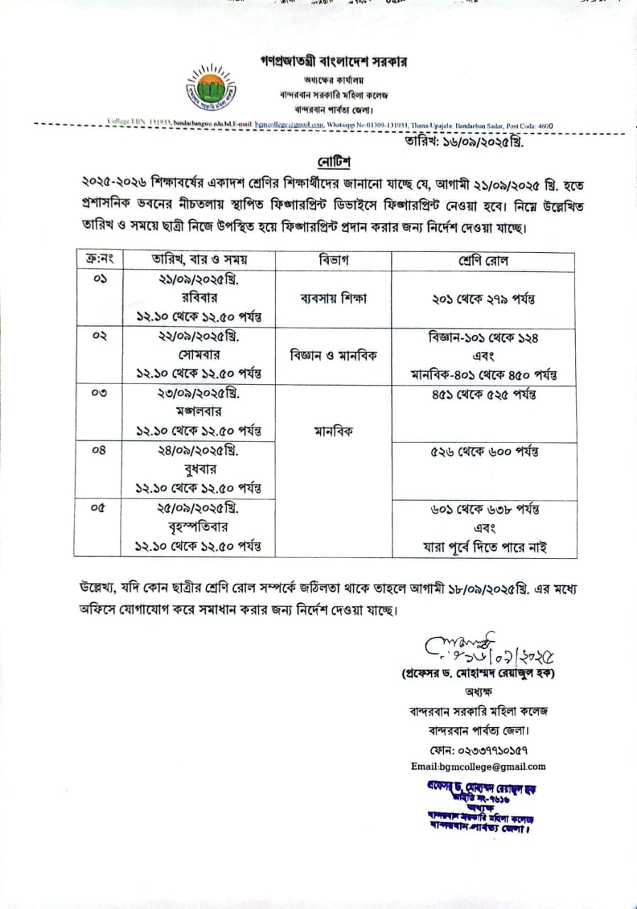 ২০২৫-২০২৬ শিক্ষাবর্ষে একাদশ শ্রেণিতে ভর্তিকৃত ছাত্রীদের ফিঙ্গারপ্রিন্ট গ্রহণ নিম্নলিখিত সময়সূচী অনুযায়ী গ্রহণ করা হবে।